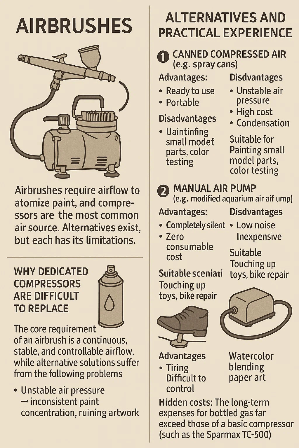 ایربراش برای اتمیزه کردن رنگ به جریان هوا نیاز دارند و کمپرسورها رایج ترین منبع هوا هستند. گزینه های جایگزین وجود دارد، اما هر کدام محدودیت های خود را دارند.