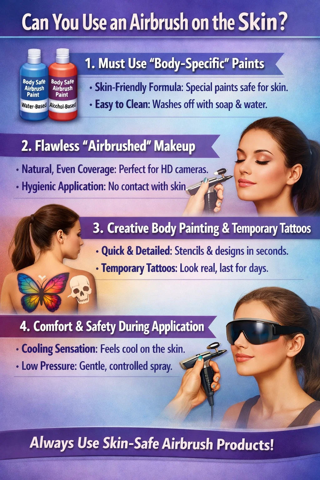 فرمول سازگار با پوست: رنگهای ایربراش که مخصوص پوست طراحی شدهاند، معمولاً بر پایه آب یا الکل هستند و ترکیبات آنها با استانداردهای ایمنی آرایشی مطابقت دارد. آنها بافت بسیار سبکی دارند و مانند رنگ های معمولی منافذ را مسدود نمی کنند و باعث ایجاد حساسیت نمی شوند.