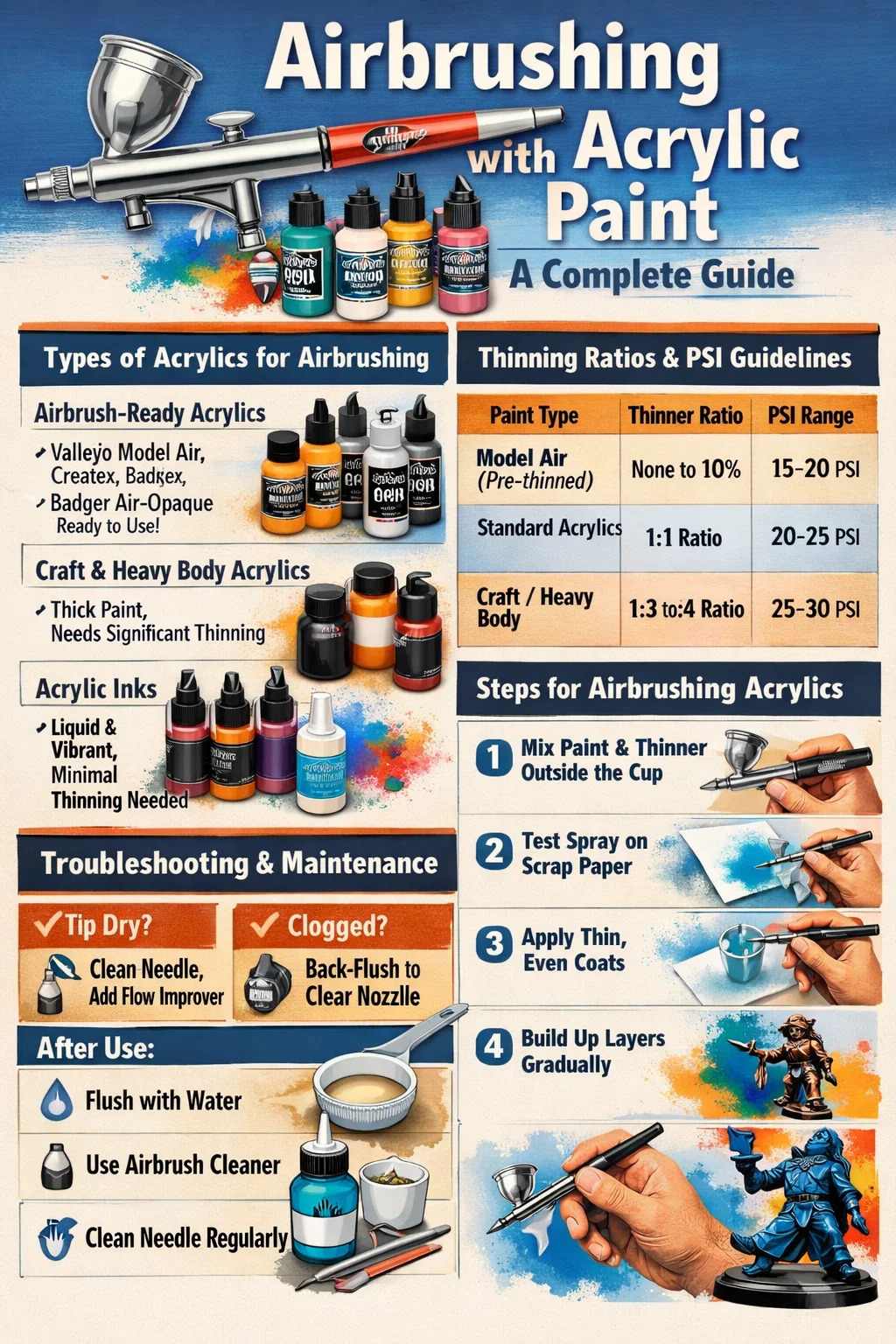 با استفاده از آب مقطر برای نازک کردن اولیه قابل قبول است، اما اختصاصی است تینر ایربراش برتر است. این تینرها حاوی «بهبودکننده جریان» و «تأخیرکننده» هستند که زمان خشک شدن را کاهش میدهند. این امر حیاتی است زیرا اکریلیک ها با تبخیر خشک می شوند. بدون کندکننده، رنگ میتواند حتی قبل از اینکه از ایربراش خارج شود، روی نوک سوزن خشک شود، پدیدهای که به آن معروف است. "نوک خشک."