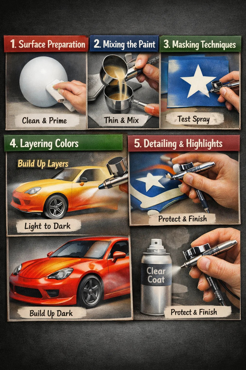 ایجاد یک تصویر یا اثر هنری کامل با استفاده از ایربراش اساساً فرآیندی است برای "ساخت لایه هایی از روشن به تاریک". شما می توانید آن را به عنوان "پاشیدن نور و سایه" بر روی سطح یک جسم در نظر بگیرید.