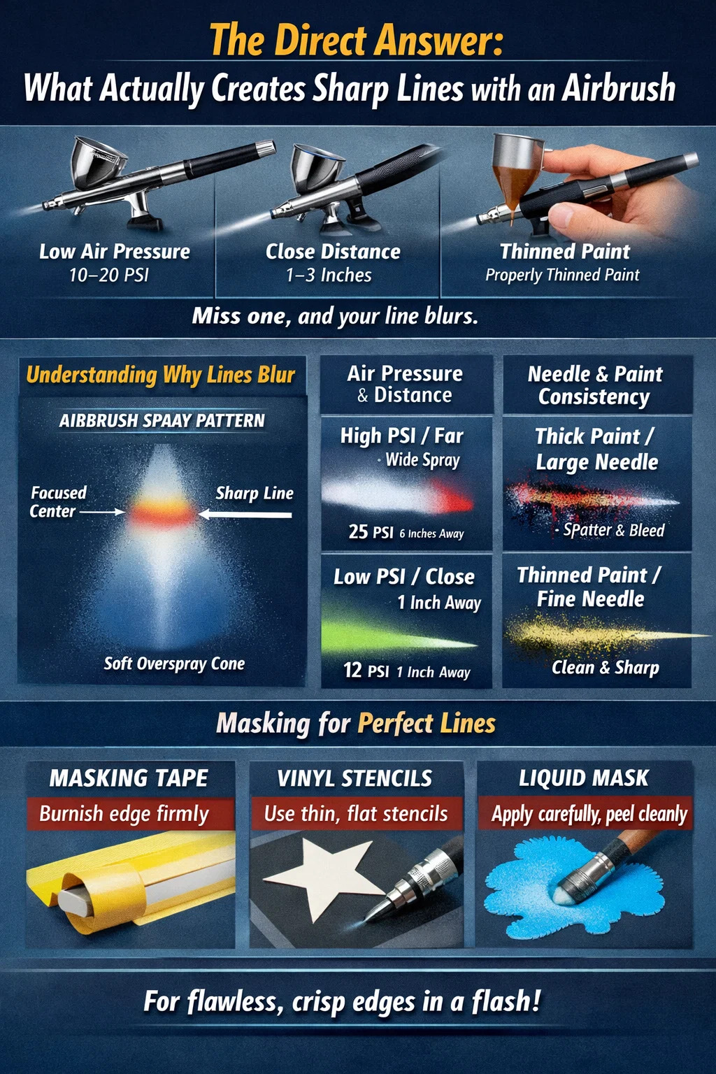 خطوط تیز با ایر براش به چهار متغیر اصلی که با هم کار می کنند کاهش می یابد: فشار هوای پایین (معمولاً 10-20 PSI) ، فاصله کاری نزدیک (1 تا 3 اینچ از سطح)، رنگ به درستی رقیق شده و کنترل عمدی ماشه. حتی یکی از این موارد را از دست بدهید، و خط شما نرم می شود، خونریزی می کند یا پاشیده می شود. بیشتر مبتدیان به دلیل اینکه خیلی دور از سطح کار می کنند و فشار زیادی را اعمال می کنند با مشکل مواجه می شوند – دو عادتی که دقت را فوراً از بین می برند.